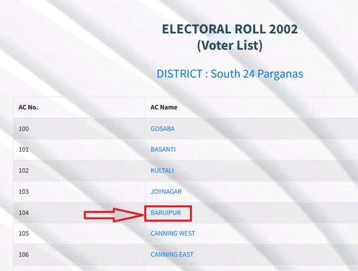 • Now select your Assembly Constituency (AC) and Pick your relevant AC (e.g., Joynagar, Mathurapur, Diamond Harbour, Falta, Satgachhia, Bishnupur, panihati, Sonarpur, Bhangar, Canning Paschim, Canning Purba, Baruipur, barasatPurba, Basanti, Kultali, Jaynagar, Mandirbazar, Magrahat Purba, Magrahat Paschim, Diamond Harbour, Falta, Satgachhia, Bishnupur, Sonarpur Dakshin, Baruipur Paschim, Maheshtala, Budge Budge, etc. — South 24 Parganas has around 31 ACs).