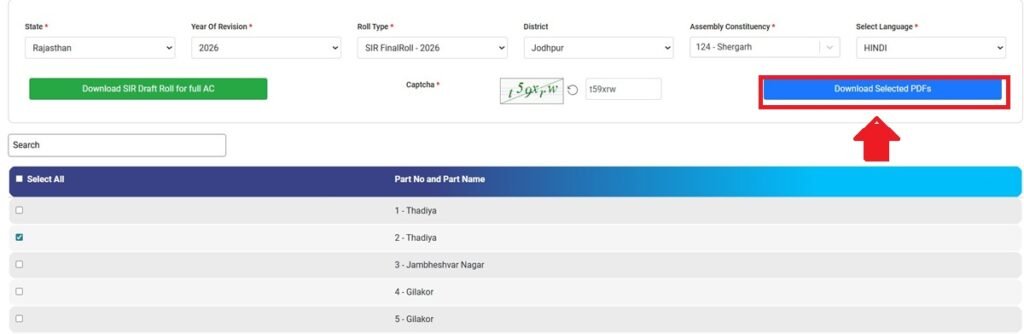 - कैप्चा कोड डालकर सबमिट करें जोधपुर के पार्ट नंबर वाली पूरी लिस्ट स्क्रीन पर आएगी (बूथ नंबर 1 से 200+ तक हो सकते हैं)