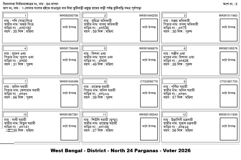 West Bengal – District – North 24 parganas voter list 2026 available to pdf download with photo. West Bengal, the Draft Electoral Roll for the Special Intensive Revision (SIR) 2026 was published on December 16, 2025. This is the draft roll, where you can check your name, view details, and file claims/objections if there are any errors. The final roll will be published later.
